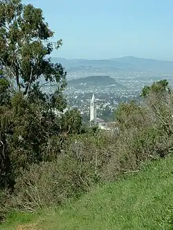 ![]() View from Claremont Canyon Regional Preserve. March 13, 2004. The University of California, Berkeley's Sather Tower is in the near view. Behind that is Albany Hill, and the large mountains in the background are the Marin Hills. | |