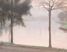 In 1925, Herald reviewer and staunch anti-modernist James S. MacDonald[31] was especially derogatory, favouring, if anything, the flower studies that Beckett regarded as minor in comparison with her landscapes.[32] By 1931, however, her friend and colleague among the Tonalists Percy Leason,[33] writing a long review in Table Talk,[34] said that Beckett's work showed "a convincing illusion of actual space and air and light; the same refinement and delicacy of true color; the same regard for true form and character; and the same complete indifference to conventions and the mere clever handling of paint for the sake of it."
