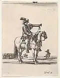 A trumpeter in medieval costume plays a trumpet with a piston. This type of single-valved clarion was specially designed for the performance of the "Triumphal March" of Giuseppe Verdi 's Aida.