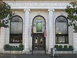 The museum is housed in the former The Bank of Eureka & The Savings Bank of Humboldt Building (1911) in Old Town Eureka, which is listed on the National Register of Historic Places both as an individual landmark and as a contributing building to the Eureka Historic District.[4] The bank building was designed by noted San Francisco architect Albert Pissis in a Classical Revival or Neoclassical style.[5] The building is notable for its glazed architectural terra-cotta facade. Quoined pavilions flank the recessed portico supported by ionic columns and an extensive balustraded parapet appears above the cornice.[6]