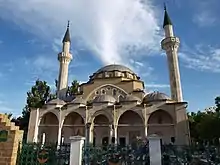 Around the same time as the Şehzade Mosque construction Sinan also built the Mihrimah Sultan Mosque (also known as the Iskele Mosque) for one of Suleiman's daughters, Mihrimah Sultan. It was completed in 1547–1548 and is located in Üsküdar, across the Bosphorus.[62][63] It is notable for its wide "double porch", with an inner portico surrounded by an outer portico at the end of a sloped roof. This feature proved popular for certain patrons and was repeated by Sinan in several other mosques.[64] One example is the Rüstem Pasha Mosque in Tekirdağ (1552–1553).[65] Another example is the Sulaymaniyya Takiyya in Damascus, the western part of which (including a mosque and a Sufi convent) was built in 1554–1559.[66][67][68][69]