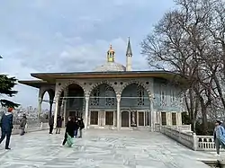 Ottoman sultans traditionally built monumental mosques and religious complexes in their name. After the Ottoman conquest of Constantinople in 1453, Sultan Mehmed II built the Fatih Mosque between 1463 and 1470, which is dedicated to his name. It was part of a very large külliye (religious and charitable complex) which also included a tabhane (guesthouse for travelers), an imaret (soup kitchen), a darüşşifa (hospital), a caravanserai (hostel for traveling merchants), a mektep (primary school), a library, a hammam (bathhouse), shops, a cemetery with the founder's mausoleum, and eight madrasas along with their annexes.[13][14] Unfortunately, much of the mosque was destroyed by an earthquake in 1766, causing it to be largely rebuilt by Mustafa III in a significantly altered form shortly afterwards. The original design of the mosque, drawing on the ideas established by the earlier Üç Şerefeli Mosque, consisted of a rectangular courtyard with a surrounding gallery leading to a domed prayer hall. The prayer hall consisted of a large central dome with a semi-dome behind it and flanked by a row of three smaller domes on either side.[15] The design reflected the influence of the Byzantine-built Hagia Sophia combined with the Ottoman imperial mosque tradition that had evolved in Bursa and Edirne.[15][16][17]