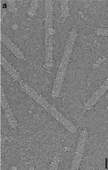 The virons are bacilliform in shape and 143 nanometers (nm) in length and 15.8 nm in diameter.[1][3] One end is pointed and the other is rounded. The structure of the APBV1 virion has been solved by cryo-electron microscopy to near-atomic resolution, revealing how the helical particle is built from an alpha-helical major capsid protein with a unique structural fold.[3] Virions are highly thermostable and remain infectious after incubation at 100 °C for 3 h