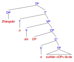 Mandarin Cleft sentence (ex.1): "Zhāngsān shì zuótiān lái-de."