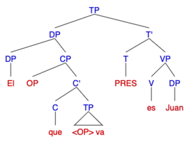 In English, it-clefts consist of the pronoun it, followed by a form of the verb to be, a cleft constituent, and a complementizer, which introduces a relative clause that is attributed to the cleft phrase.[1] It-clefts introduce two meanings parts: (1) a presupposition that the property in the clause following the complementiser holds of some entity; and (ii) an assertion that this property holds of the entity denoted by the cleft constituent.[1]