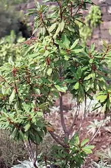 It is an evergreen narrowly upright shrub or small tree, growing to about 6 m tall and 4 m wide. The foliage is dense and glossy, with the leaves up to 7–10 cm long. The flowers are small, white and fragrant, similar in appearance to those of lily of the valley, hence the common name. (Lily of the valley is not closely related, being a monocotyledon.) The flowers are grouped in terminal panicles and bloom in early to mid summer.[4] The plant is toxic to humans; it contains andromedotoxin which may cause diarrhea and even sudden death.[5]