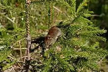 Northern red-backed voles inhabit areas that contain dense ground cover for protection from weather and predation.[5][9] On the Kenai National Wildlife Refuge in south-central Alaska, the presence of northern red-backed voles was positively correlated with protective cover.[6] During the winter, northern red-backed voles use layers of thick moss or matted vegetation as thermal cover.[5][10] During the mid-winter months in a spruce forest of central Alaska, all northern red-backed voles on a control area aggregated in a small area of thick moss cover, despite abundant food resources elsewhere on the trapping grid.[5]