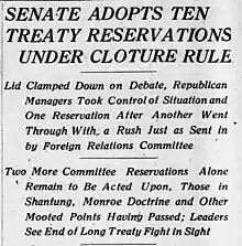 On 8 March 1917, during World War I, a rule allowing cloture of debate was adopted by the Senate by a vote of 76–3[27] at the urging of President Woodrow Wilson,[28] after a group of 12 anti-war senators managed to kill a bill that would have allowed Wilson to arm merchant vessels in the face of unrestricted German submarine warfare.[29] This was successfully invoked for the first time on 15 November 1919,[30] during the 66th Congress, to end a filibuster on the Treaty of Versailles.[31]