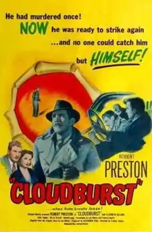 Cloudburst is a 1951 British crime drama film produced by Hammer Films, directed by Francis Searle, starring Robert Preston and featuring Elizabeth Sellars, Harold Lang, Colin Tapley and Sheila Burrell. The script is based on a play written by Leo Marks,[1] a wartime cryptographer for the Special Operations Executive, and later the author of a memoir about his wartime work, Between Silk and Cyanide (1998).