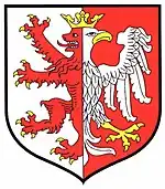 The coat of arms of the Łódź Voivodeship, Poland is an Iberian-style escutcheon with square top and rounded base. It is divided horizontally into three stripes (pales), that area from left to right: yellow (golden), red, and yellow (red), with the middle stripe being twice as big as the other stripes. It also include three charges placed in its center, with two placed next to each over, on the top of the third one. The top two charges are Kuyavian Hybrids, divided into half, into a lion and an eagle, while the bottom one is an eagle. It was designed by Marek Adamczewski, and officially adopted on 25 June 2002.[1][2]