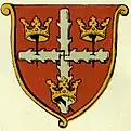 This shield, which can be blazoned as Gules, two staves raguly and couped argent, one in pale, surmounted by another in fess between two ducal coronets in chief Or the bottom part of the shaft enfiled with a ducal coronet of the last[2] or alternatively Gules two silver ragged staves joined in the form of a cross, its arms and foot pierced by Passion Nails; and three golden crowns, the bottom encircling the foot of the cross[4] was in use until 1915. It had been in use since at least 1558,[5] where it was mentioned in the heralds' visitation of that year.[5] It is thought to have been created by heralds wishing to remove the reference to a revered relic during the Reformation.[6]