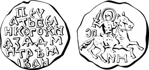 The symbol of the horseman passed down through the generations: from Dmitry to his son Vasily I, then to Vasily II and Ivan III. A coin which featured the image became known as kopeck, from kopyo, the Russian word for "spear".