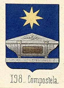 The sinister half of the shield contains the coat of arms traditionally attributed to Santiago de Compostela before being codified in municipal regulations.[1] The elements on the shield are emblems of the city; the azure tincture of the field is used by the Kingdom of Galicia. The central element of the field is the tomb of the Apostle James, represented on a cloud and placed below an eight-pointed star of gold (or). The sepulchre and the star allude to the medieval tradition that narrates the discovery of the remains of the apostle by Pelagius the Hermit, who claimed to have observed a mysterious brightness during several nights over the Libredón forest.[5]