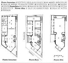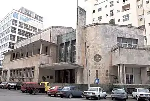 The circulation of the Colegio Nacional de Arquitectos building is through a double-loaded corridor. It was one of the first curtain walls to be used in Cuba.[4] The building consists of a semi-basement and two floors that houses offices, a library, recreation rooms, an auditorium, and a large spiral staircase that forms a large space on three levels which is illuminated by natural light from three panels of glass blocks. It has several outdoor porches. On the outside, coral stone and green Cuban marble are used. The main part of the building (auditorium) is covered by a gable roof, the rest of the building has a flat roof.
