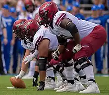 Colgate offensive linemen prepare for the snap during a 2019 game