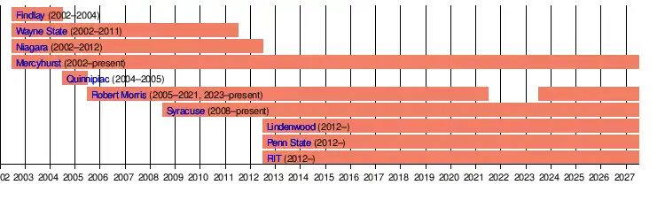 | Niagara University | Lewiston, New York | Purple Eagles | 1999–2010 | 2000, 2004, 2008 | Atlantic Hockey[4] | ||