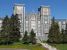 Tower Hall is St. Scholastica's castle-like central building. Its origins date to a picnic in around 1907, when the Diocese of Duluth's Bishop James McGolrick commented that the top of the hill at the college's current site was a perfect location for a building.[9] According to the historic records of Sister Agnes Somers, McGolrick and a group of students and sisters climbed to the top of the hill and placed a pile of stones, symbolizing the cornerstone of what would eventually become Tower Hall.[9] In 1906, architects Anton Werner Lignell and Frederick German were hired to draw the plans for the school, Villa Sancta Scholastica Academy, and the motherhouse. Mother Scholastica Kerst disapproved of the plans due to potential defects in the building's design, and the two architects were fired from the project in 1908; it was taken over by Franklin Ellerbe.[10][11][12] The following year saw the groundbreaking and start of construction for Tower Hall. Its first unit was completed in 1909. That September, 75 students from the Institute of the Sacred Heart were relocated to what was then called Villa St. Scholastica. Tower Hall was completed in 1928, and had two towers, a north to south axis of 375 feet, turrets at each end, recessed fenestration, and Tudor towers flanking the façade.