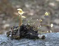 The gills are adnate (bluntly fused to the stem), becoming subdecurrent with age (running slightly down the length of the stem). The gill spacing is close to subdistant, and the individual gills are whitish to pinkish-buff, thin, narrow to moderately broad, and have straight edges. The stem is 10–50 mm (0.4–2.0 in) long by 1–2 mm (0.04–0.08 in), and roughly equal in width throughout its length. It is slender and thread-like, flexible and pliant, with a dry surface. The top of the stem is covered with scales or a fine whitish powder, while the lower portion has hairs ranging from delicate to coarse. The color of the stem is generally whitish to pinkish-buff, but it darkens after it has been handled. The stem interior is pithy, and becomes hollow with age. The stems originate from a dark reddish-brown sclerotium of variable shape, typically measuring 3–12 mm (0.12–0.47 in) by 2–5 mm (0.08–0.20 in). The surface of the sclerotium is initially smooth, but later becomes wrinkled or furrowed; its interior is solid and white.[13] It is often compared to an apple seed in appearance.[12][16] Typically, several sclerotia are connected by thin strands of mycelia.[12] The sclerotium is a resting structure that allows to fungus to overwinter in its host.[17] In 1915, William Murrill reported the sclerotia of C. tuberosa to be bioluminescent.[18]