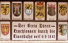 The first section from Cologne to Müngersdorf was opened on 2 August 1839, less than four years after the Nuremberg–Fürth railway, the first German railway, and was the seventh railway on German territory.[8] To this end, open and closed carriages and wagons were delivered by Waggonfabrik Talbot of Aachen using road transport at the beginning of the year. Another section from Müngersdorf to Lövenich was opened on 2 July 1840.[9] The last section from Lövenich to Aachen was opened on 1 September 1841 with an inaugural trip from Cologne to Aachen and back, during which a banquet for 360 invited guests was held.[5] Regular passenger services on the whole route commenced on 6 September 1841.[6] A panel on the east side of Düren station still marks this event.