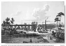 The Cologne–Aachen railway was used for military purposes again during the Battle of France. Trains carrying troops and war equipment ran over the line. During the war, the line was a frequent target of air raids, causing damage particularly in Aachen and Cologne. The last through train from Aachen to Cologne ran on 12 September 1944.[19] A refugee train from Eschweiler was strafed on 15 September 1944.[6] The locomotive of a passenger train occupied by about 200 was attacked, so it stopped at Hücheln near Langerwehe.[20] Subsequently, a train formed of locked freight wagons was attacked with bombs and gunfire.[6][20] About 80 people died in the process.[21] Rail traffic from Eschweiler was discontinued on that day.[6][20] Rail traffic from Düren was discontinued after the air raid on Düren on 16 November 1944.[22] When German troops withdrew, they blew up bridges, such as parts of the Burtscheid Viaduct and the Three Arch Bridge (Dreibogenbrücke).