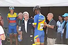 IOC President Thomas Bach congratulating roller skater Jhony Angulo Reina for his gold medal.