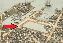 As seen in the 1872 Bird's Eye View of Charleston, the northwest corner of Colonial Lake originally was land that was possible to develop with a few houses. In 1874, the houses were removed so that improvements to Colonial Lake could continue.[1]