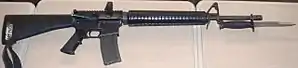 A Colt Canada C7A1 with the bayonet attached. The rear sight element is a back up iron sight (BUIS).