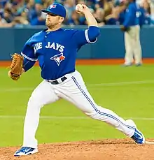 ![]() Colt Hynes pitching on his final MLB appearance game with the Toronto Blue Jays on April 18, 2015 | |