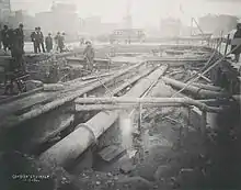 By 1901, construction on the first subway line of the Interborough Rapid Transit Company (now the IRT Broadway–Seventh Avenue Line, used by the 1, 2, and 3 trains) required the excavation of the circle, and the column and streetcar tracks through the area were put on temporary wooden stilts. As part of the subway line's construction, the 59th Street–Columbus Circle station was built underneath the circle.[12][13] During construction, traffic in the circle was so dangerous that the Municipal Art Society proposed redesigning the roundabout.[11][14] By February 1904, the station underneath was largely complete,[15] and service on the subway line began on October 27, 1904. The station only served local trains; express trains bypassed the station.[16][17] The platforms of the IRT subway station were lengthened in 1957–1959, requiring further excavations around Columbus Circle.[18]