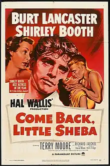 Come Back, Little Sheba is a 1952 American drama film directed by Daniel Mann in his directorial debut and produced by Paramount Pictures. The script was adapted by Ketti Frings from the 1950 play of the same title by William Inge. Starring Burt Lancaster, Shirley Booth, Terry Moore, and Richard Jaeckel, the film tells the story of a marriage between a recovering alcoholic and his frumpy wife that is rocked when a young college student rents a room in the couple's house. The title refers to the wife's little dog that disappeared months before the story begins and that she still openly grieves for. Booth, who had originated her role on Broadway and was making her film debut, won Best Actress honors at the Academy Awards, the Golden Globes, and the New York Film Critics Circle Awards.