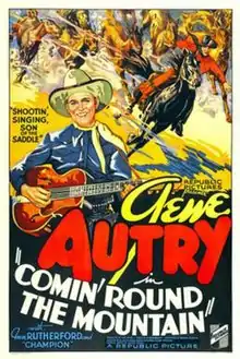 Comin' Round the Mountain is a 1936 Western film directed by Mack V. Wright and starring Gene Autry, Ann Rutherford, and Smiley Burnette. Based on a story by Oliver Drake, the film is about a Pony Express rider who is robbed and left to die in the desert, where he is saved by a wild horse he captures and later uses to round up other horses to be used in the race for a government contract.[1]