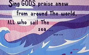 On September 12, 1982, the Chapel sponsored a "Jewish Pride in the Navy Day," that included the dedication of an 11 by 7 foot cloth-on-cloth wall hanging for the chapel, designed by local Norfolk artist Leonette Adler, and cut and sewn by Jewish officers, sailors, and their spouses.[11] The celebration included music on the Frazier Hall lawn by members of the Navy band, and tours of local Navy ships. As described by the Navy News, "the hanging features a backdrop of silver moon and roaring waves of blue and white and words from the prophet Isaiah."[11]