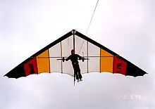 Also in 1909, British aeronautical pioneer J. W. Dunne patented his tailless stable aircraft with conical wing development. The patent included a broad-span biconical delta, with each side bulging upwards towards the rear in a manner characteristic of the modern Rogallo wing.[18] During the following year, in America U. G. Lee and W. A. Darrah patented a similar biconical delta winged aeroplane with an explicitly rigid wing. It also incorporated a proposal for a flight control system and covered both gliding and powered flight.[19][20] None of these early designs is known to have successfully flown although, in 1904, Lavezzani's hang glider featuring independent left and right triangular wings had left the ground, and Dunne's other tailless swept designs based on the same principle would fly.[19]