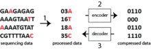 Figure 1: The principal steps of a workflow for compressing genomic re-sequencing data: (1) processing of the original sequencing data (e.g., reducing the original dataset to only variations relative to a specified reference sequence; (2) Encoding the processed data into binary form; and (3) decoding the data back to text form.