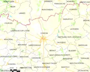 The town of Condom is located in the northern part of the department of Gers, halfway between Mont-de-Marsan (to the west) and Montauban (to the east), and north of Auch.