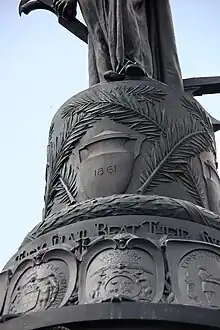 The figure stands on a round pedestal[128] decorated with palm branches and four cinerary urns. Low relief numbers on the urns refer to the four years of the American Civil War (1861, 1862, 1863, and "1864–65").[42] Beneath the round pedestal is a round plinth in the form of a wreath of wheat. Below the plinth is a round base on which is inscribed: "And they shall beat their swords into ploughshares and their spears into pruning hooks."[141][126][42][138] It is a partial quotation from Isaiah 2:4.