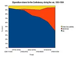 While, unsurprisingly, military spending constituted the largest part of the national government's budget over the course of the war, over time the payment of interest and principal on acquired debt grew as a share of the Confederate government's expenditure. While initially, in early 1861, war expenditure was 95% of the budget, by October 1864 that share fell to 40%, with the majority of the rest (56% overall) being accounted for by debt service. Civilian expenditures and spending on the Navy (recorded separately from general war expenditures in Confederate records) never exceeded 10% of the budget.[1]