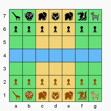 The starting setup is as shown. White (brown pieces in the diagram) moves first. Players alternate turns; there is no passing. The game is won by capturing the opponent's lion. The game immediately ends when a lion has been captured.