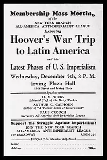 In the early 1920s, many Communist Parties affiliated with the Communist International (Comintern) maintained "Anti-Imperialist Departments" dedicated to building broad coalitions in opposition to the economic and military intervention of capitalist powers in the affairs of smaller colonial nations.[1] In the Western hemisphere this took the form of organizing against the expansion of American commercial influence in the developing nations of Central and South America as well as the Caribbean basin, including especially Mexico, the Dominican Republic, Cuba, and Nicaragua.[2]