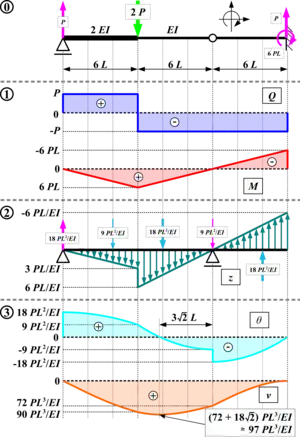 (0) real beam, (1) shear and moment, (2) conjugate beam, (3) slope and displacement