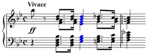 The strongest homophonic (harmonic) cadence, the authentic cadence, dominant to tonic (D-T, V-I or V7-I), is in part created by the dissonant tritone[39] created by the seventh, also dissonant, in the dominant seventh chord, which precedes the tonic.