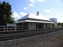 The first railway built in Queensland ran from Ipswich to Dalby. This line was opened to Bigge's Camp (now Grandchester) on 31 July 1865. It extended to Gatton in 1866 through multiple tunnels including the Victoria Tunnel, to Toowoomba in 1867 and to Dalby in 1868.[5] The railway was extended from Ipswich to Brisbane in 1876.[6] The line from Dalby had been extended to Chinchilla in 1878, Roma in 1880, Charleville in 1888 and Cunnamulla in 1898.
