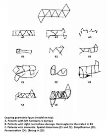 Patients with damage to their right hemisphere have trouble correctly replicating spatial relationships of complex figures. Drawing elements are often piecemeal, transposed to different positions or orientations, or shown diagonally on the page.[5] As a result, right hemisphere patients tend to produce asymmetric or distorted drawings[6] characterized by hemispatial neglect, the omission of elements from one side of the model.[7] It was once thought that right hemisphere patients were twice as likely to make mistakes in 3D construction tasks as left hemisphere patients but this inaccurate conclusion was attributable to participant selection bias in that researchers excluded from studies individuals with severe left hemisphere lesions due to the debilitating language impairments of those individuals. However, included in studies were individuals with severe right hemisphere lesions.[8] Subsequent research has substantiated the absence of a marked difference in performance between left and right hemisphere patients on 3D construction tasks.[9]