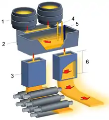Continuous casting (Tundish and Mold). 1: Ladle. 2: Tundish. 3: Mold. 4: Plasma torch. 5: Stopper. 6: Straight zone.