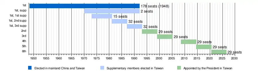 | 1973 1st supp | 15 | Elected in Taiwan with 6-year terms; then extended to 8 years | |||