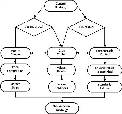 Decentralized control or market control is typically maintained through factors such as price, competition, or market share. Centralized control such as bureaucratic control is typically maintained through administrative or hierarchical techniques such as creating standards or policies. An example of mixed control is clan control which has characteristics of both centralized and decentralized control. Mixed control or clan control is typically maintained by keeping a set of values and beliefs or norms and traditions.