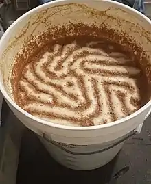 6-gallon bucket of honey wine after fermenting 10 days with cinnamon floating on top. Convection is caused by yeast releasing CO2.