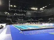 The 2017 European Short Course Swimming Championships was the first major sporting event in the arena, with a capacity of circa 12,500.[9] The arena was one of two arenas (the other being Jyske Bank Boxen) to host the 2018 IIHF World Championship.[10][11] The Royal Arena was one of eight venues in Denmark and Germany to host the 2019 World Men's Handball Championship. It was also used for the 2018 Spring European League of Legends Championship Series third-place decider and finals on 7 April 2018, and 8 April 2018, respectively.[12]