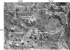 The Cordillera de Lípez is a mountain range in northern Potosí, Bolivia, and northern Argentina, part of the Andes. The range covers an area of 23,404 km2 (9,036 sq mi) and runs in a northeast–southwest direction, between the parallels 22 degrees and 23 degrees, helping to form the boundary between Bolivia and Argentina. Thus the Cordillera de Lípez is a transverse range in the Andes, between the Cordillera Oriental and the Cordillera Occidental, creating the southern boundary of the Bolivian Altiplano.