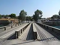 To the west of the Isthmus is the Gulf of Corinth, and to the east the Saronic Gulf. Since 1893 the Corinth Canal has run through the 6.3 km (3.9 mi) wide isthmus, effectively making the Peloponnese an island. Today, two road bridges, two railway bridges and two submersible bridges at both ends of the canal connect the mainland side of the isthmus with the Peloponnese side. Also a military emergency bridge is located at the west end of the canal.